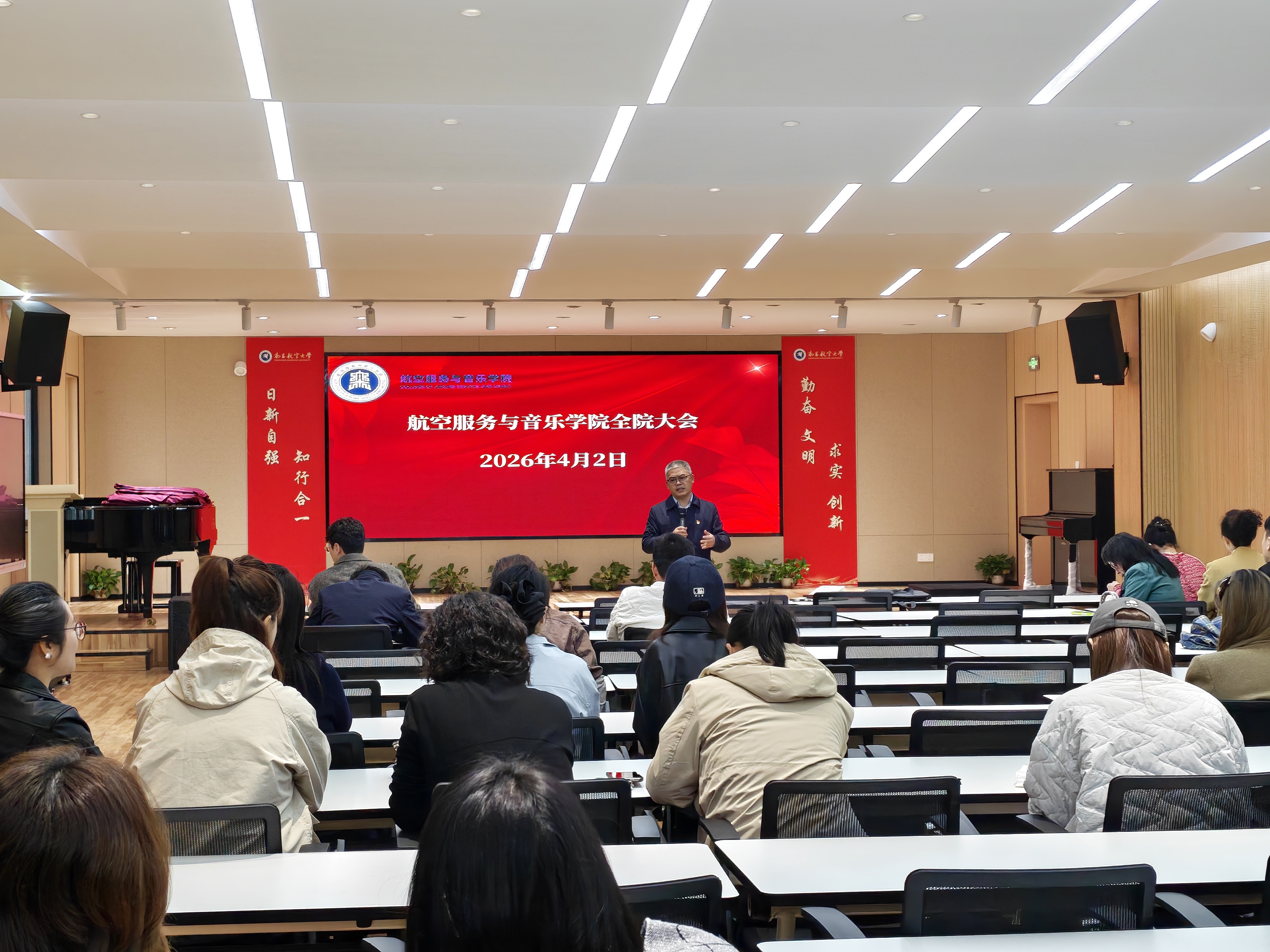 会上,学院党委副书记、副院长郑飞传达了学校2026年全面从严治党暨警示教育大会会议精神,要求全体教职工严守纪律规矩,筑牢思想防线。她通报了学院2026届毕业生当前就业进展,希望全体教师共同助力学生顺利就业,并对清明假期相关安全工作进行了布置。学院主持工作副院长王铭勋重点部署教学和科研工作,要求大家充分发挥航空服务艺术与管理、音乐两大专业特色,扎实做好美育工作,提升育人实效。最后,学院党委书记徐武俊对近期的党的建设、立德树人等重点工作进行安排,要求大家统一思想,凝心聚力,在推进党建项目品牌化、发挥舞台影响力、提升美育贡献度和培养人才创新性上取得新的突破。